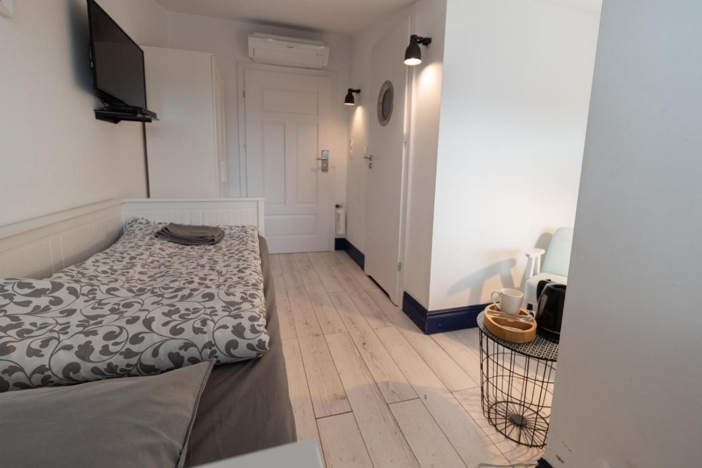 Studio. Studio to ma dźwiękoszczelne ściany. W łazience znajduje się prysznic i suszarka do włosów. Dla Gości przygotowano zestaw do parzenia kawy i herbaty. Studio wyposażone jest w telewizor z płaskim ekranem, szafę i ogrzewanie. Podłoga wyłożona jest parkietem. W tej opcji zakwaterowania jest dostępne 1 łóżko. Studio - 4 osobowy. Powierzchnia pokoju ok.: 25 mkw. ;